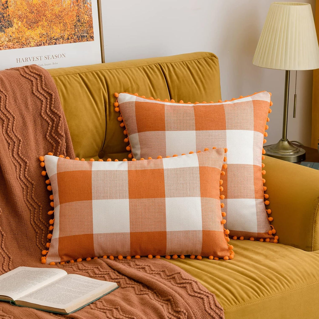 Set of 2 Fall Throw Pillow Covers 18X18 Inch Buffalo Plaid Check Pillow Covers with Pom-Poms Decorative Couch Throw Pillows Farmhouse Cushion Cases for Sofa Orange and White